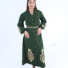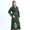 A woman is wearing a long dress in a warm neutral shade with a vintage-inspired design. The dress features a collar and a full button-down front. The long sleeves are voluminous and gathered at the wrists, accented with golden embroidery on the forearms. A matching fabric belt with a woven decorative pattern cinches the waist. The hem of the dress is finished with two large, symmetrical golden embroidered motifs.